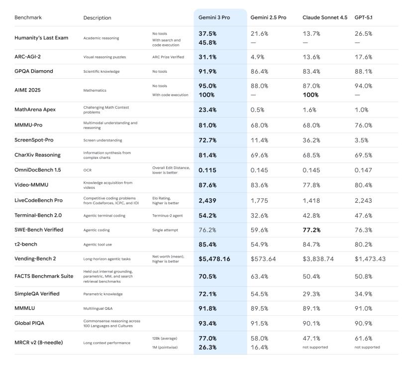 这次 Gemini 3 的主打卖点也很熟悉:更强的推理、更自然的对话、更原生的多模态理解。官方号称,在一堆学术基准上全面超越了 Gemini 2.5 以及各路竞品。