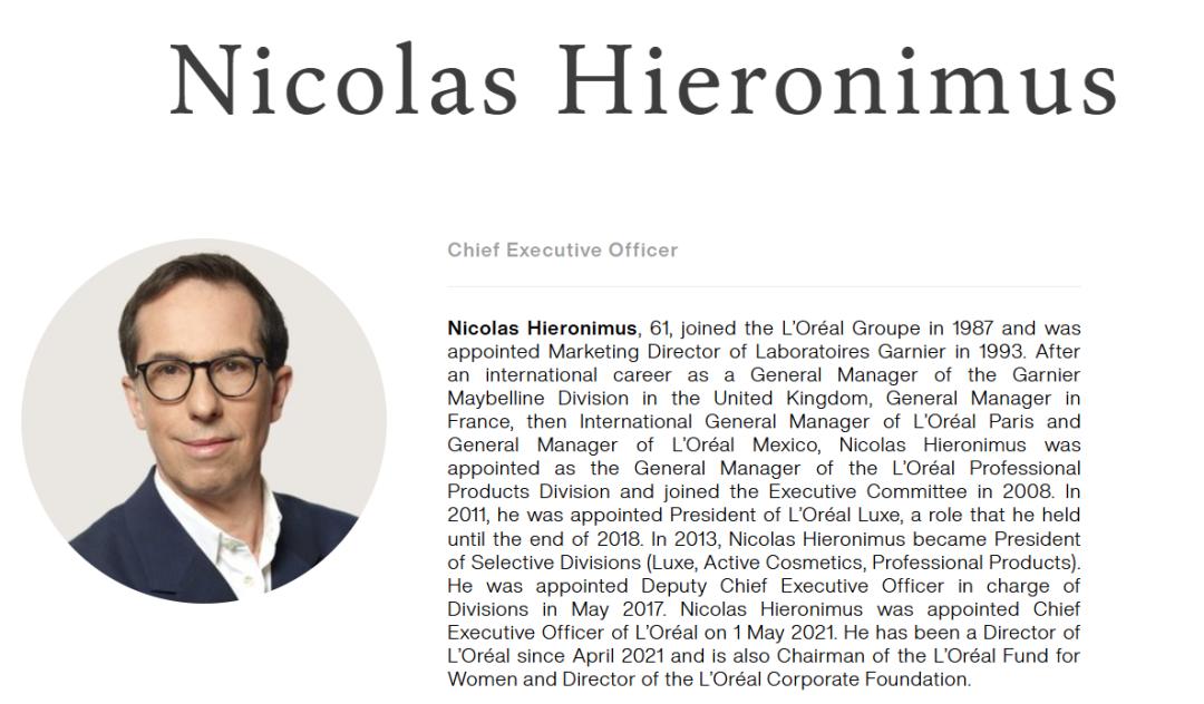 根据欧莱雅集团公示的信息,Nicolas Hieronimus的职业生涯中曾担任过卡尼尔和美宝莲英国区总经理、巴黎欧莱雅法国总经理,随后升任巴黎欧莱雅国际总经理,2005年被任命为欧莱雅墨西哥总经理,也曾执掌欧莱雅集团专业美发产品部、高档化妆品部,2020年被任命为欧莱雅集团首席执行官。