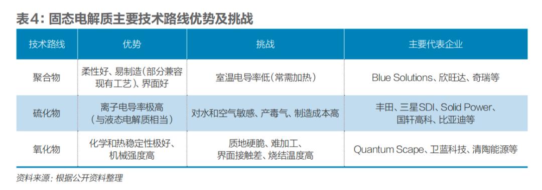 “全固态”与“半固态”在技术上有本质差异。全固态电池是在材料、工艺和性能上对现有技术的颠覆性创新。而固液电池是基于现有液态锂离子电池体系的改良,它在材料体系、制造工艺和设备方面高度继承了液态锂电池产业链,本质仍未脱离液态锂电池的范畴,性能提升也相对有限。