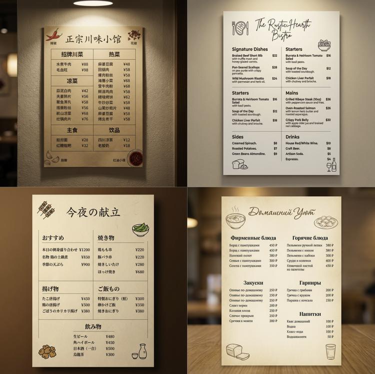 我们尝试让 Nano Banana Pro 生成“英文、中文、日文和俄罗斯语”四种菜单。