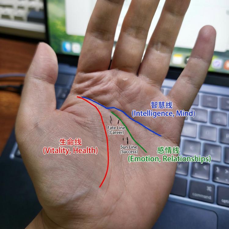 可以看到 Nano Banana Pro 像一个算命先生一样清晰的画出手上的生命线、感情线和智慧线。然而,Nano Banana Pro 并没有学到家,把智慧线和生感情线画反了。
