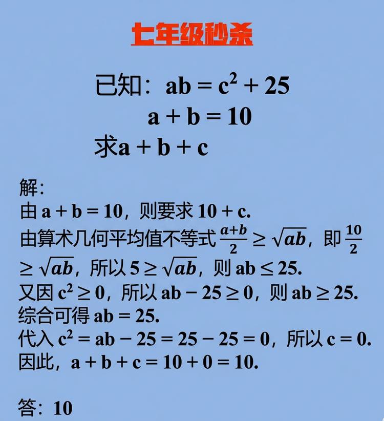 首先是第一题代数题,GPT5 的回答是:这题在「初中数学默认前提:a,b,c 为实数,且 a,b\ge 0」的条件下,是对的。唯一可以挑的刺是:AM-GM 需要 a,b\ge0 的前提,题目没写,但在七年级题目里一般是默认的,所以在这个教学语境下,这份解答是成立的。
