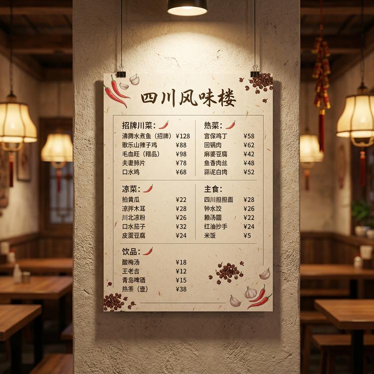 Sichuan restaurant menu poster,vertical A4 layout hanging on a textured wall,warm spotlight from above, soft shadow under the menu,light beige paper with subtle fiber texture,modern Sichuan style, clean grid layout,small corner illustrations: chili peppers, Sichuan peppercorns, garlic cloves,handwritten-style Chinese title, clear body font,only Simplified Chinese text, no English,cozy indoor lighting, slight vignette, natural restaurant ambience,high resolution, 4k, printable, no watermark, no logo.Menu text (Chinese only):招牌川菜:沸腾水煮鱼(招牌) ¥128 歌乐山辣子鸡 ¥88 毛血旺(精品) ¥98 夫妻肺片 ¥78 口水鸡 ¥68 热菜:宫保鸡丁 ¥58 回锅肉 ¥62 麻婆豆腐 ¥42 鱼香肉丝 ¥48 蒜泥白肉 ¥52 凉菜:拍黄瓜 ¥22 凉拌木耳 ¥28 川北凉粉 ¥26 口水茄子 ¥32 皮蛋豆腐 ¥24 主食:四川担担面 ¥28 钟水饺 ¥26 赖汤圆 ¥22 红油抄手 ¥24 米饭 ¥5 饮品:酸梅汤 ¥18 王老吉 ¥12 青岛啤酒 ¥15 热茶(壶) ¥38