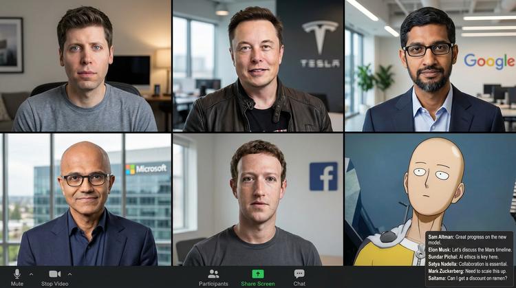我们先来一个简单的测试,让现实 AI 界五大巨头和动画界的光头共同开一场视频会议。