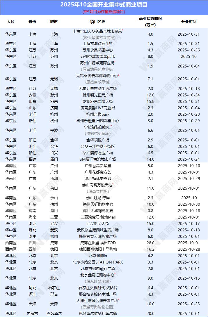 10月开业项目中,存量商业改造项目7个,合计商业体量约50万㎡。