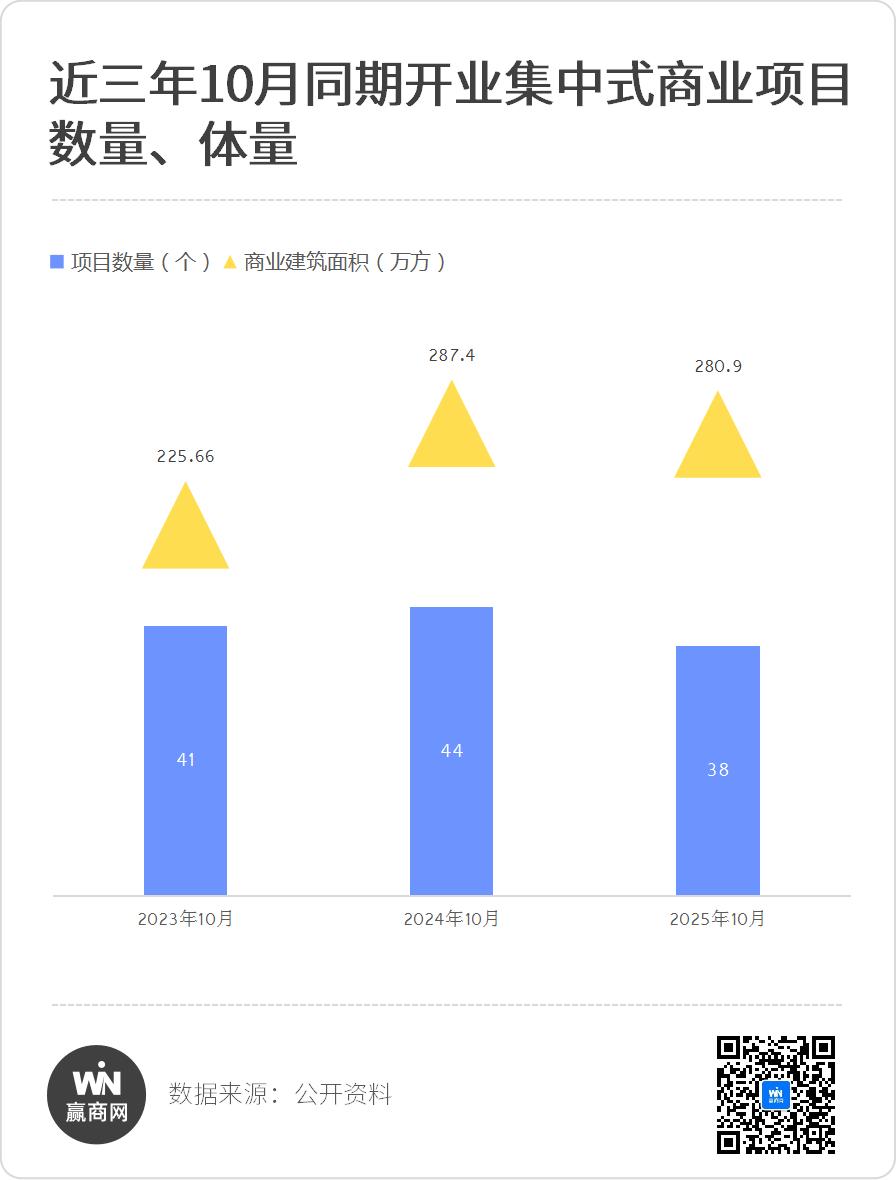 据赢商大数据不完全统计数据,2025年10月全国开业集中式商业项目38个,商业总体量约281万㎡,环比9月(58个项目,体量490万㎡)呈现大幅回落,数量、体量分别下降了34.48%、57.38%。