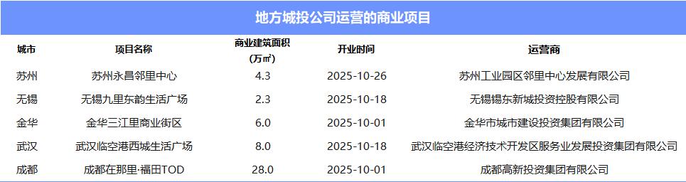 值得注意的是,新开业项目频繁出现地方城投公司的身影,尤其是社区商业、邻里商业等小体量项目。如苏州永昌邻里中心、无锡九里东韵生活广场、金华三江里商业街区、武汉临空港西城生活广场、成都在那里·福田TOD等,均是地方城投公司主导运营的项目。