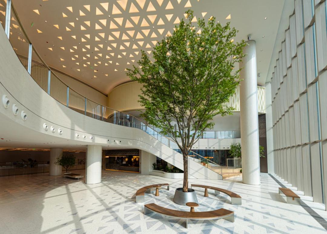 项目连廊覆盖的树形屋顶,一共43组,高35-40米,每组科技树覆盖面积约1039㎡,冠幅直径约40米,柱径2.5米,冠幅造型以银杏叶为灵感,形成建筑的独特个性。除了遮日蔽荫,还集空气质量调控,收集雨水、灯光联动等多种使用功能为一体,是高科技元素的集中体现。