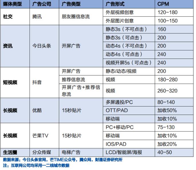 另据财通证券研报统计的多类型广告关键指标CPM(千次展示成本),多家互联网公司的APP广告CPM在100-300元不等,而国内电梯广告的代表分众传媒,其CPM仅为40-50元,是上述互联网广告成本的一半不到。