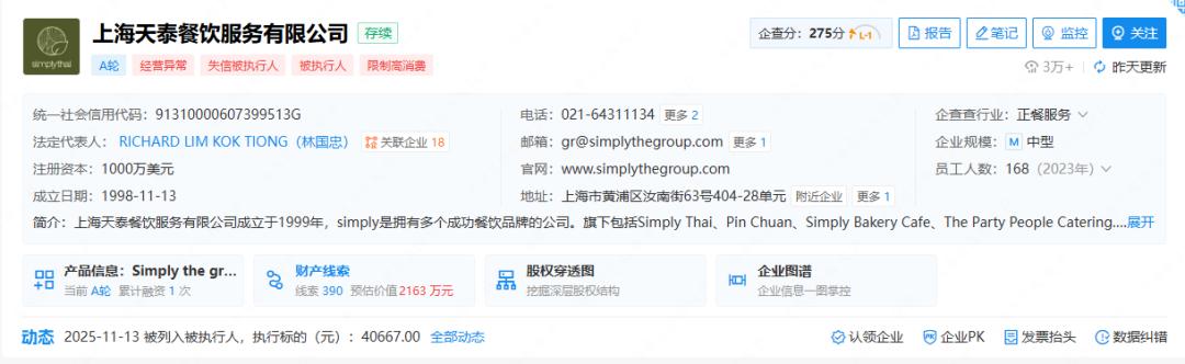 再往前,2024年底,有“上海泰国菜鼻祖”之称的simplythai天泰,南京、上海等多地关店,还被曝拖欠员工工资、断缴社保。(详情可阅读:经营困难,批量关店!“上海泰国菜鼻祖”无奈卖身)当时有报道称,或有新的经营方接手天泰。