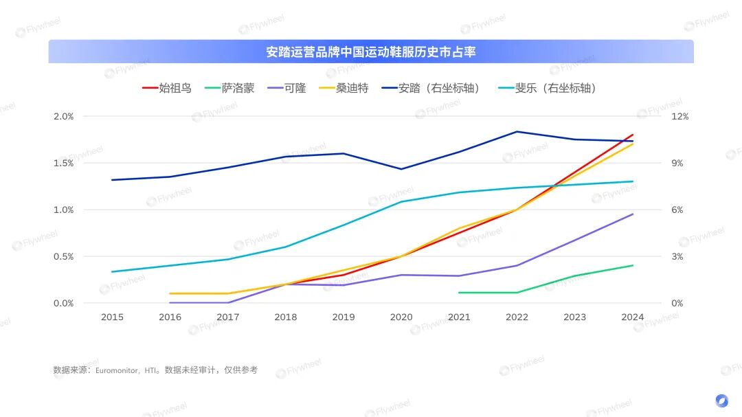 在国内,安踏的市占率同样持续攀升。通过收并购策略,安踏构建起了覆盖中高端市场的多品牌矩阵,包含始祖鸟、萨洛蒙、桑迪特、可隆、狼爪等知名户外品牌,并以23%的市场整体份额,成为中国运动鞋服领域的龙头。