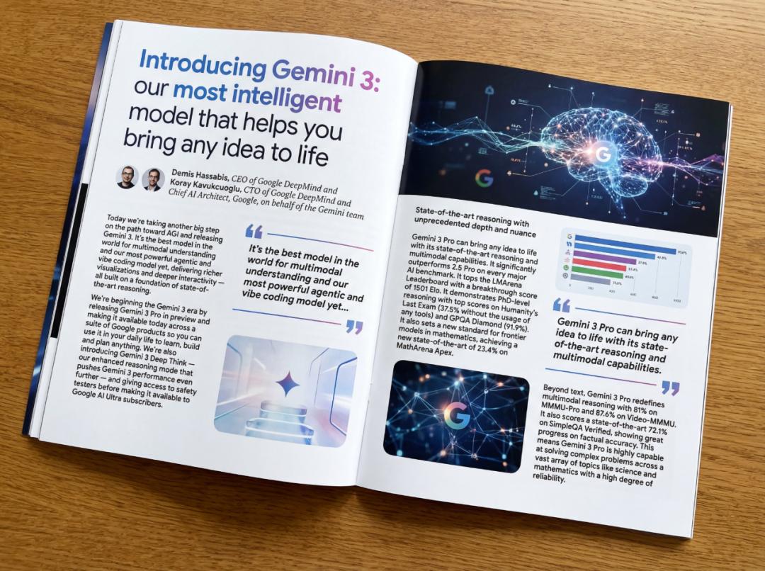 把谷歌博客照搬进一本杂志里,什么配图、排版……通通Nano Banana Pro自己搞定。