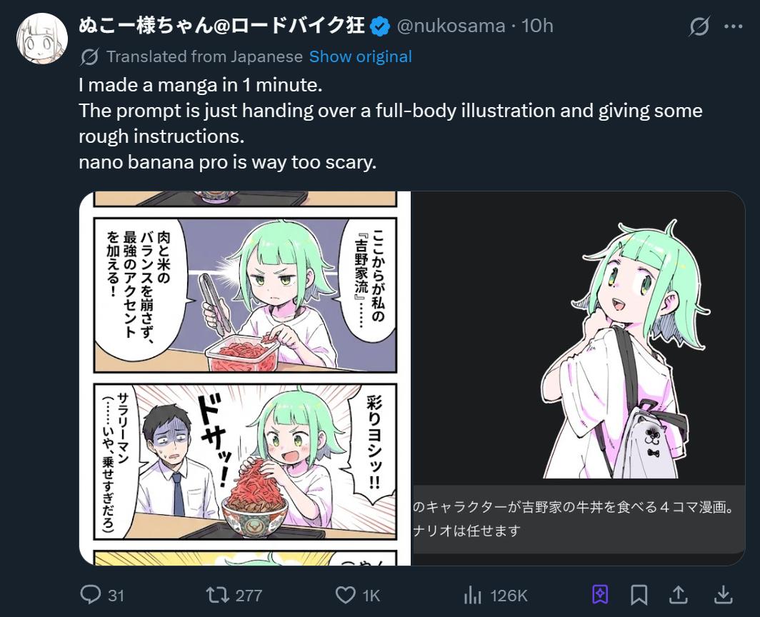 给一张人物参考图,Nano Banana Pro仅需1分钟就生成了带故事情节的条漫,制作水平令网友直呼可怕。