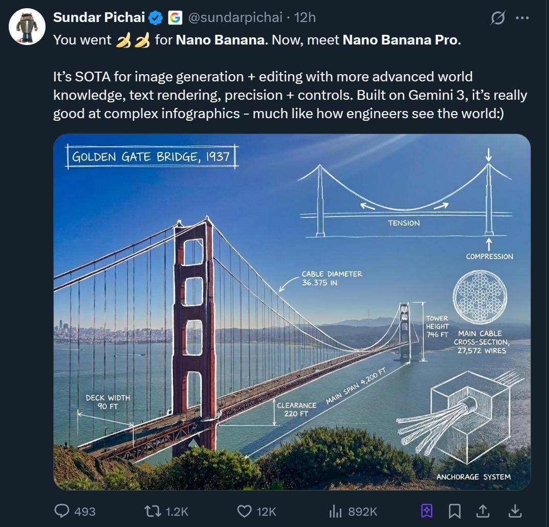 它又名Gemini 3 Pro Image,整合了Gemini 3 Pro的多模态理解能力以及谷歌搜索的知识库,能理解现实语义与物理逻辑。