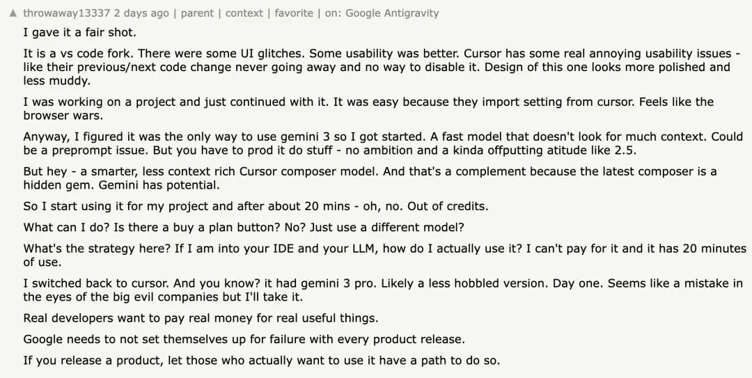2025 年 7 月,谷歌“收编” Windsurf 首席执行官 Varun Mohan 及其团队。仅仅 4 个月后的 11 月 18 日,他们就发布了面向 AI 驱动编码的 Antigravity IDE。这样的节奏可谓风驰电掣,但也几乎注定这款产品并不完美——上线没多久,用户吐槽就已经堆满了社交平台。