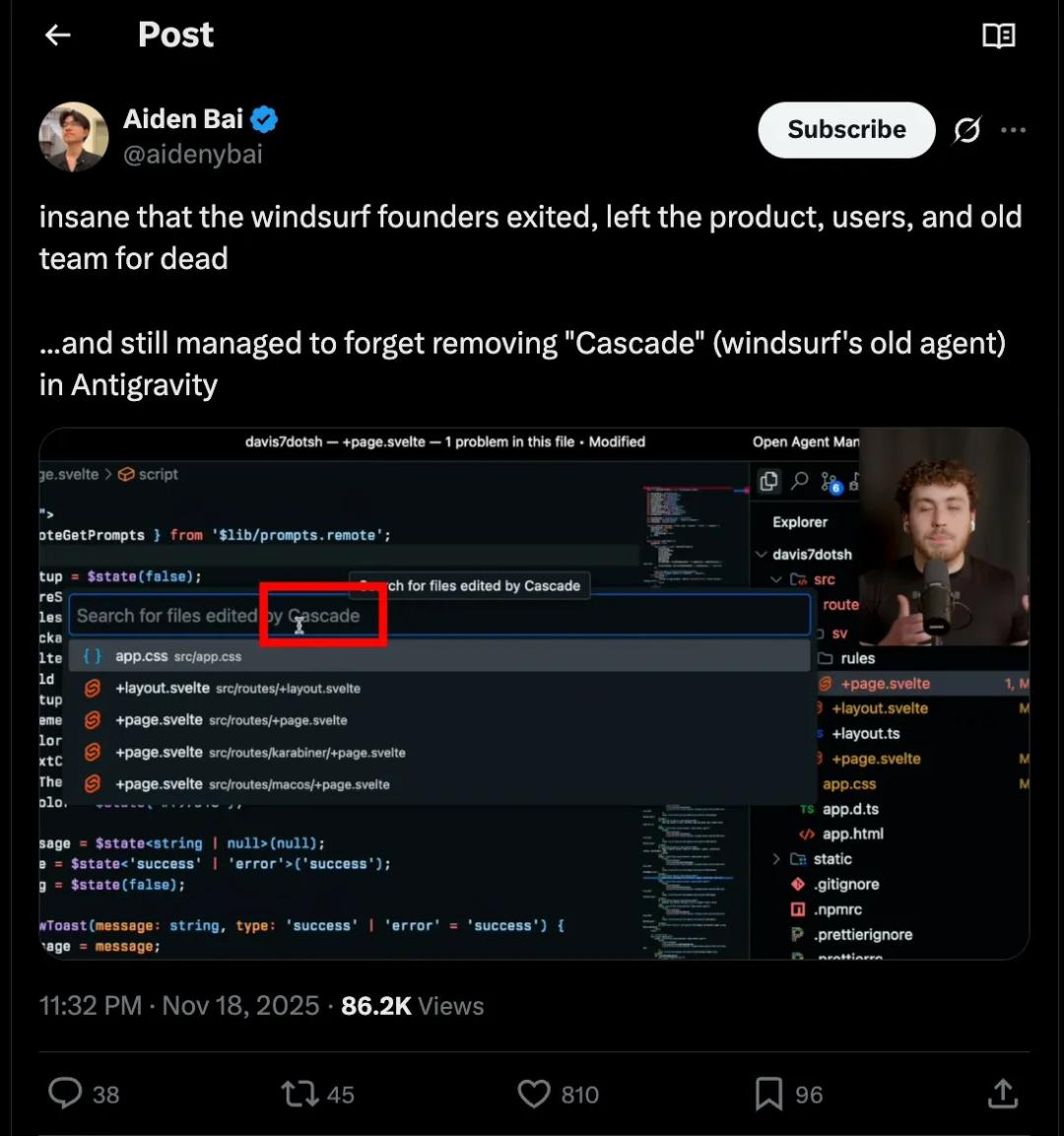 有开发者在 Antigravity 中发现了 Windsurf 私有代理系统 Cascade 的直接引用,这类内部命名本不可能偶然出现。