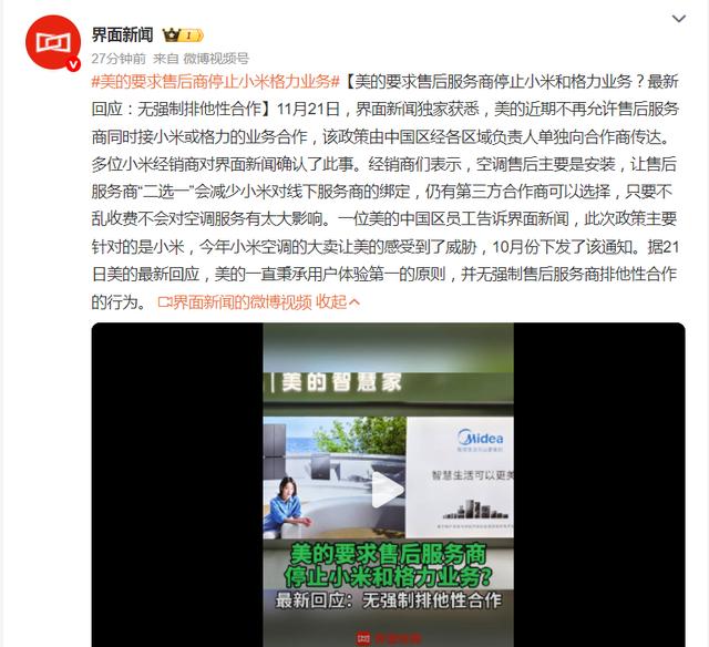 今天上午,媒体《界面新闻》独家报道了“美的要求售后停止小米格力业务”的消息,相关话题很快空降微博热搜,数小时后的午间时分,媒体《第一财经》、《每日经济新闻》等又相继进行跟踪报道,强调美的集团进行了否认:“无强制售后服务他性合作的行为。”