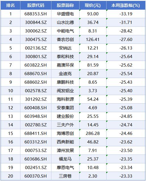 本周个股跌幅榜前五位分别是华盛锂电、山水比德、中能电气、香农芯创、安纳达,累计跌幅分别为33.19%、31.71%、28.42%、27.60%、26.13%。