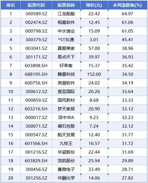 个股方面,本周个股涨幅榜前五位分别是江龙船艇、榕基软件、中水渔业、*ST东通、真爱美家,累计涨幅分别为64.97%、61.06%、61.05%、45.41%、38.96%。
