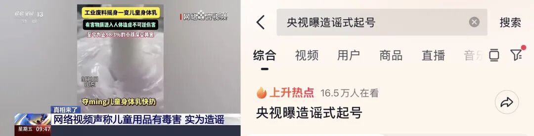 11月21日,聚美丽记者观察到央视频在抖音平台发布了一则有关“网络视频声称儿童用品有毒害,实为造谣”的报道,迅速引起关注,“央视曝造谣式起号”词条在抖音上升热点已有16.5万人在看。