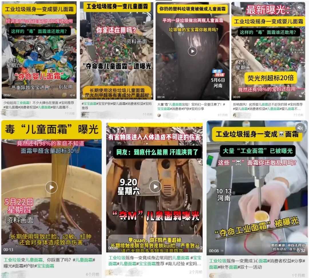 具体而言,此次央视报道揭露了工业垃圾变成儿童面霜、身体乳及洗护用品,实则为“造谣式起号”行为,即多起网络账号通过炮制儿童健康谣言“起号”的黑产链条,目的系引流带货。