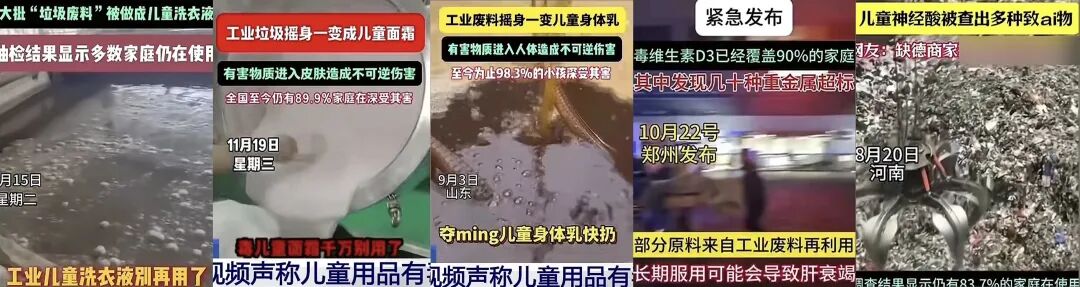 聚焦此类系列事件,可以发现标题大致为“工业垃圾摇身一变成儿童面霜”,如前文所述,也不止是面霜,还有儿童身体乳,甚至是儿童洗衣液等,均被套成了造谣模板,通过传播矩阵扩散焦虑情绪,引起视觉恐慌。难道,儿童用品竟然变成了流量密码?