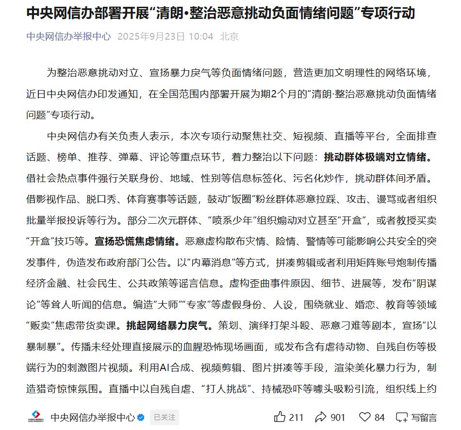事实上,针对造谣式挑动情绪的行为,国家、平台等层面都有在陆续行动。譬如,今年9月23日,中央网信办印发通知,在全国范围内部署开展为期2个月的“清朗·整治恶意挑动负面情绪问题”专项行动。