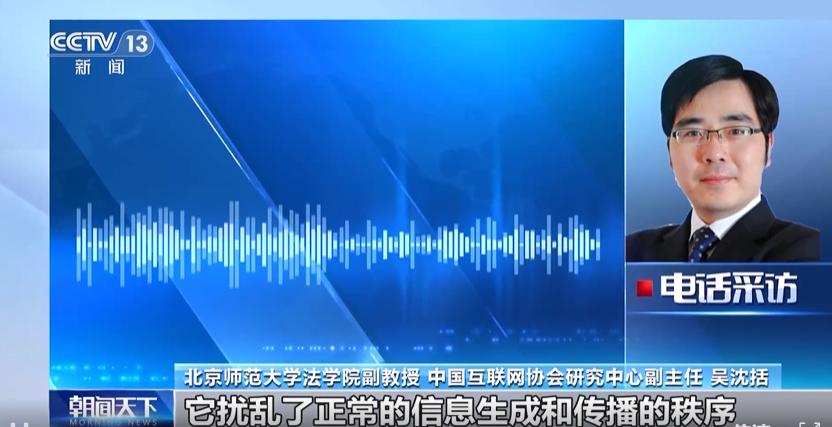 援引央视新闻专家观点,北京师范大学法学院副教授、中国互联网协会研究中心副主任吴沈括表示:“这类虚假信息扰乱了正常的信息生成和传播秩序,损害社会信任度,公众在面对这样一系列真假难辨的信息时,会产生群体焦虑。”