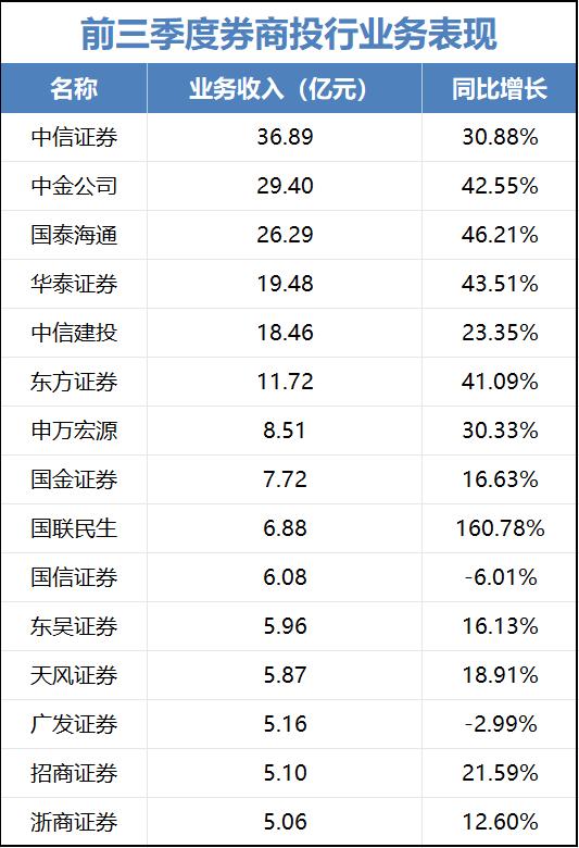 券商业绩爆发,既受“924”行情以来牛市的影响,也有A、港股IPO回暖带来的投行业务收入增长助力。今年前三季度,中信证券、中金公司、国泰海通三家券商的投行收入最高,投行业务收入前15名的券商中,有13家实现了增长。