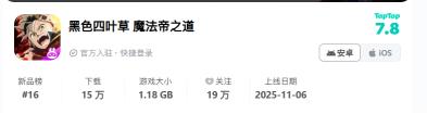 作为紫龙发行的漫改二游,成绩中规中矩。TapTap 下载量 13 万,累计关注 19万,榜单方面,iOS 免费榜最高第 3,当前跌至 30 名;iOS 畅销榜最高 86 名,当前维持在 97 名。国服前期福利优于国际服,但首周商业化表现不达预期。