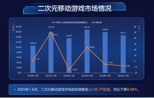 2025上半年,二次元类手游市场收入145.77亿元,同比下降8%。二游市场整体呈收入下滑态势。