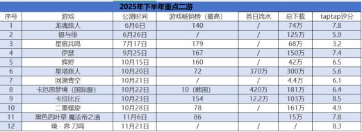 而下半年尤其是10 月后,多款二游密集上线,涵盖动作冒险、卡牌策略等多种类型。这些新游中既有尝试创新商业模式的产品,也有经典 IP 改编之作,不过市场表现差异显著。