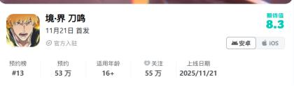 具备较高的IP 基础。游戏还原《BLEACH 境・界》的世界观和角色,搭配原版 CV,还设计了独创拼刀战斗系统。目前Taptap上预约53万,预约榜排名13,凭借庞大的粉丝基数,上线初期有望冲击iOS 免费榜前列。