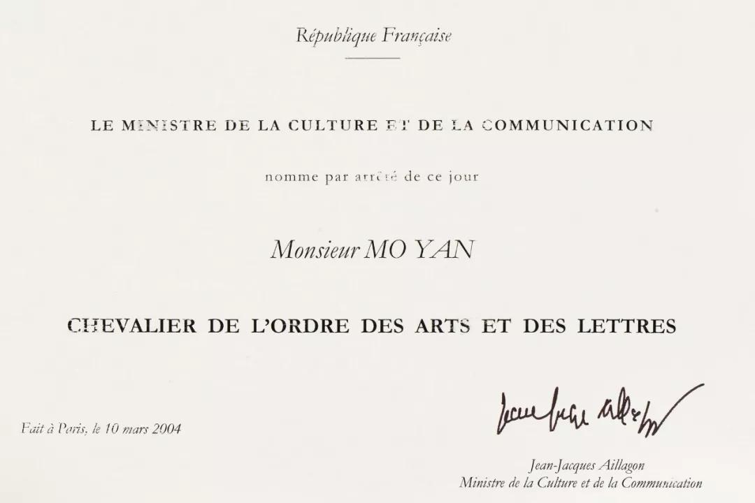 2004年,法兰西文化与艺术骑士勋章证书