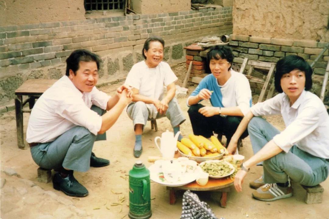 1988年,莫言(左一)与母亲及朋友在老家的院子里