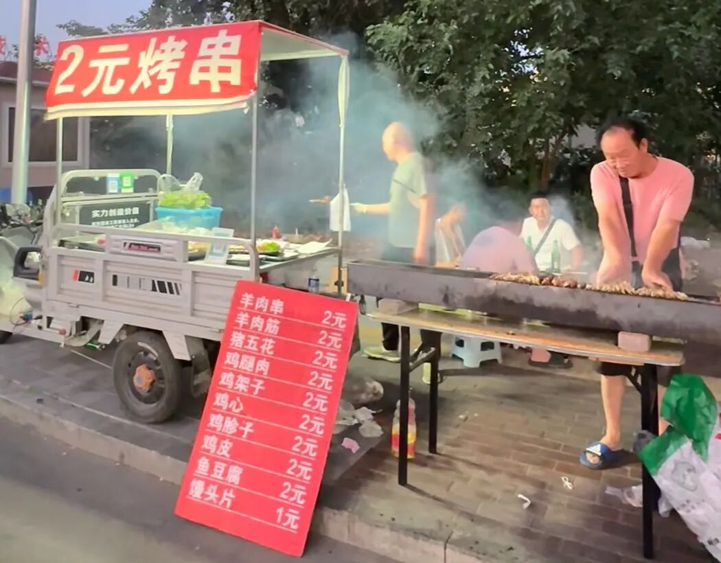 如今,一到晚上,很多人会发现今年许多城市的角落都冒出了这样的画风:一部推车,一台烧烤炉,一块醒目的“2元烧烤”招牌,就是全部家当。