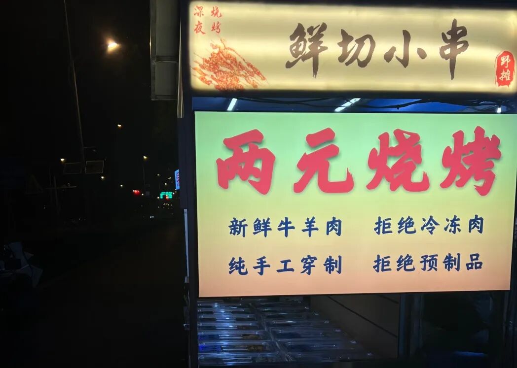 红底白字的“2元烧烤”招牌,是最犀利的视觉锤,直接击穿所有人心理防线。