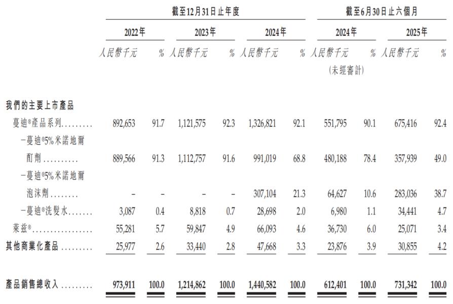 这当中,超90%的收入均来自蔓迪®系列产品,其中米诺地尔泡沫剂的收入占比从2024年上半年的10.6%攀升至今年同期的38.7%。小部分收入来自一款特应性皮炎药品——莱兹,占比约为3.4%。