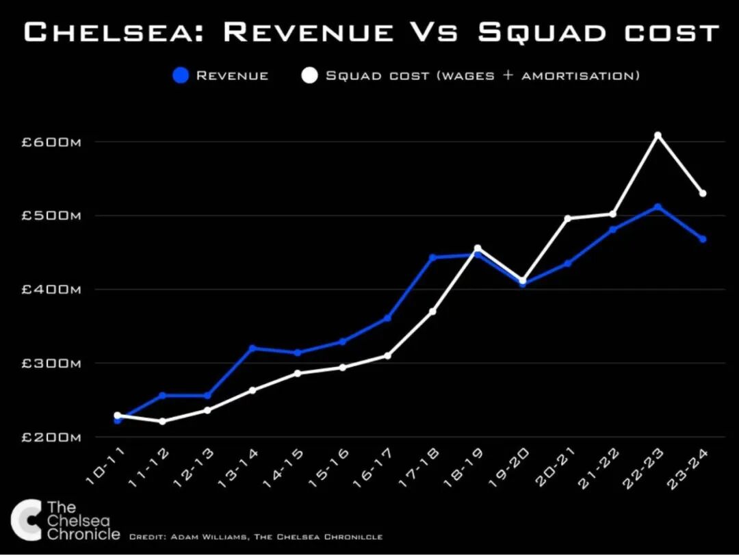 切尔西收入与阵容成本对比折线图,图:切尔西记事报