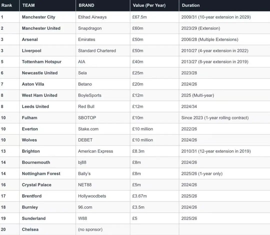 2025-26赛季英超胸前广告赞助情况一览,图:SalaryLeaks