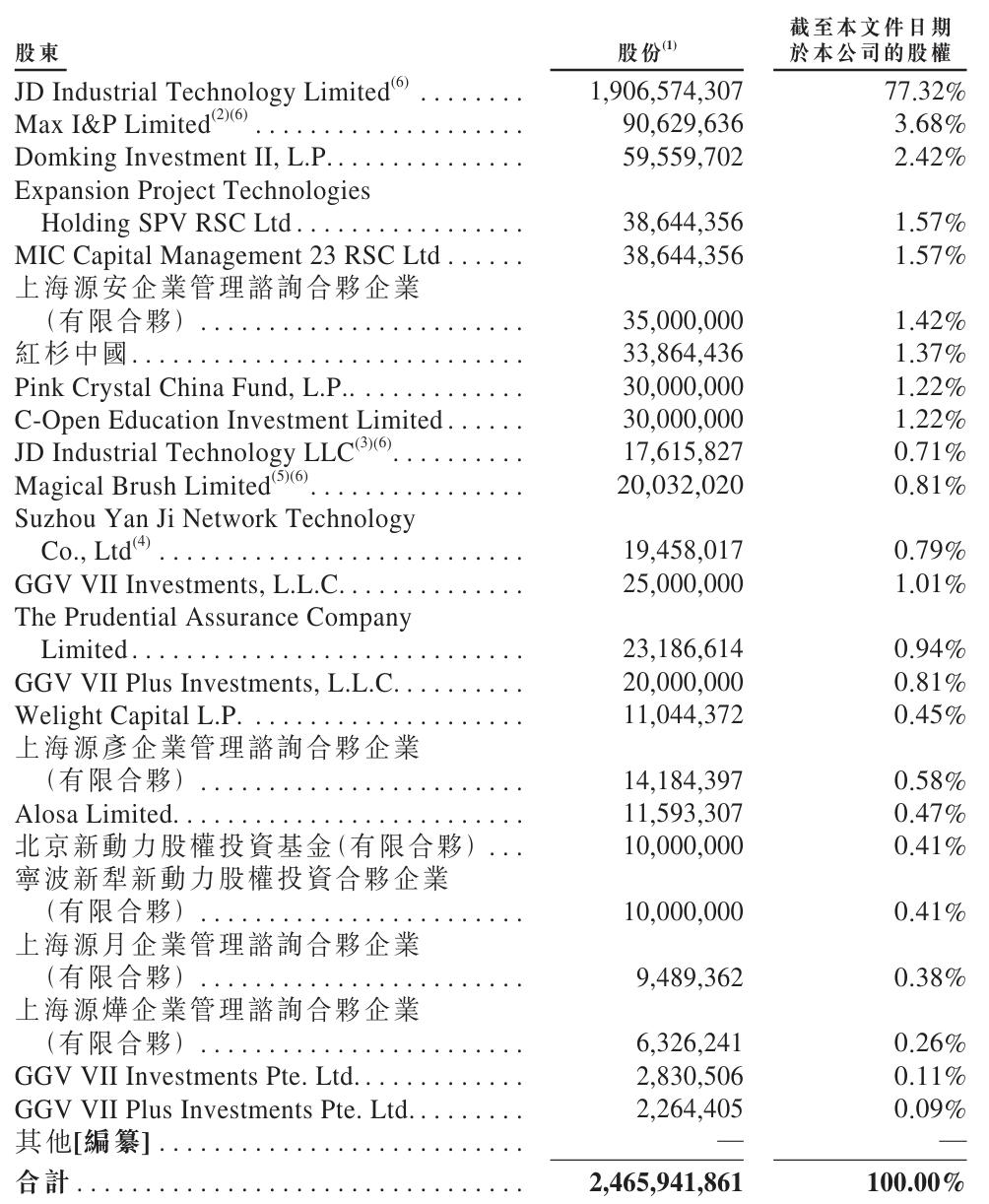 DomkingInvestment 持股 2.42% , Expansion Project Technologies 股为 1.57% , MIC Capital Management 23 RSC 持股 1.57%, 上海源安企业管理咨询合伙企业(有限合伙)持股 1.42% , 红杉中国 持股 1.37% ,Pink Crystal China Fund持股 1.22% , C-Open Education 持股 1.22% 。