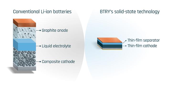BTRY固态设计与传统锂离子电池相比:精简层状结构、无需液态电解质,整体架构更纤薄安全