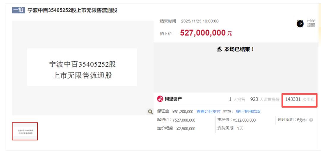 11月23日上午10时,阿里资产拍卖平台显示,宁波中百3540.53万股上市无限售流通股的拍卖正式结束。