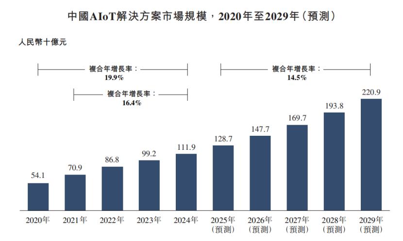 因此,中国AIoT解决方案市场呈现强劲增长态势,从2020年的约541亿元增长至2024年的约1119亿元,复合年增长率约为19.9%,预计2029年将增至2209亿元。
