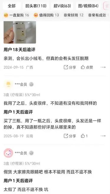 凤凰网财经《IPO观察哨》了解到,在某书及主流电商平台的用户反馈中,蔓迪产品的实际效果出现了显著分化。虽然部分购买者在追评中声称“长出了小绒毛”,但更多用户则抱怨使用后“头皮发痒”,且脱发问题并未得到改善——“该掉还是掉”。
