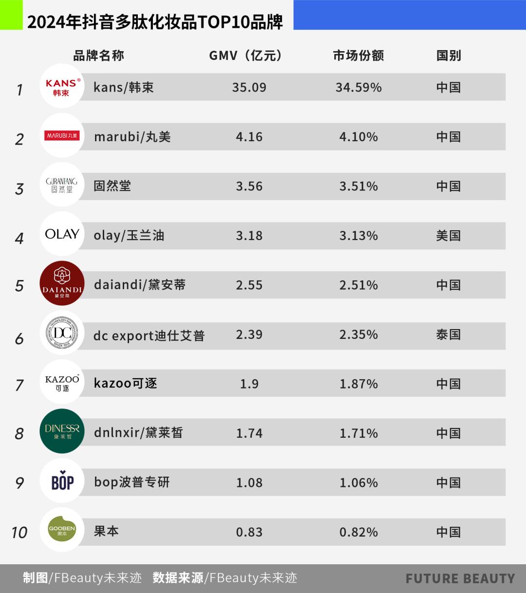 以抖音渠道为例,按产品宣称以“肽”为核心关键词的产品所产生的交易额(GMV)计算,2024年韩束品牌以34.59%的市场份额处于绝对领先地位(第二名市场份额为4.1%)。Top10品牌中8个为中国品牌,清晰展现了国产品牌在该细分领域的统治力。
