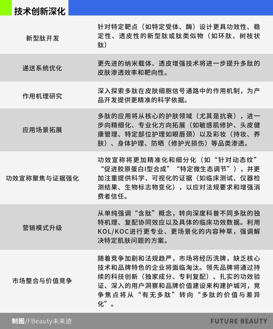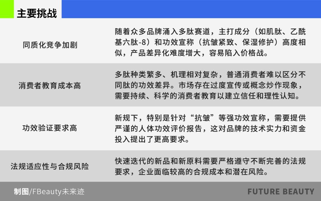 展望未来,市场在面临同质化、教育成本、功效验证和合规等挑战的同时,将朝着技术创新深化(新肽开发、递送优化)、应用场景拓展、功效宣称精准化与证据强化、营销模式升级(深度科普、场景化方案),以及市场整合与价值竞争的方向发展。