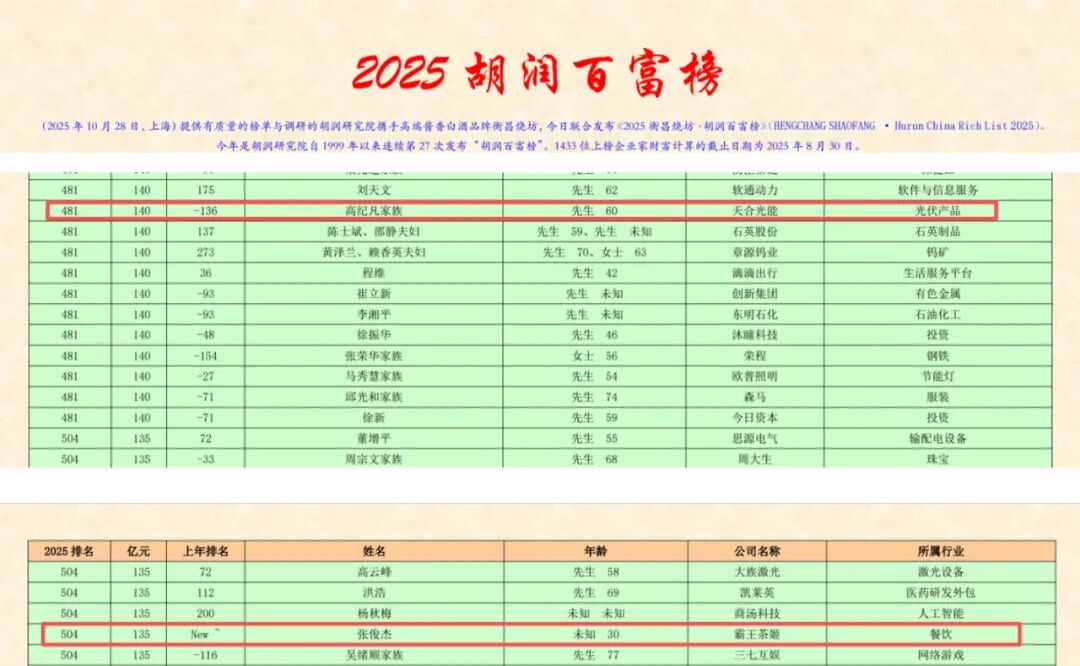 事实上,2025年,张俊杰凭借霸王茶姬上榜《胡润百富榜》,以135亿元的财富值位列第504名,与高纪凡家族的差距仅有5亿元。