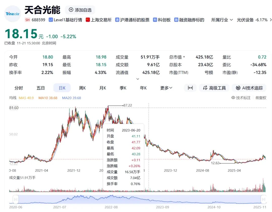 2025年上半年,天合光能营收310.56亿元,同比暴跌27.72%;归母净利润亏损29.18亿元,同比由盈转亏,跌幅超654%。光伏行业“内卷外堵”,天合光能市值从高点约2000亿缩水至425亿。高海纯本该主导的天合富家分拆上市计划,却在2024年12月黯然终止。她接手联席董事长职位时,正是父辈打下千亿基业最危急的时刻。