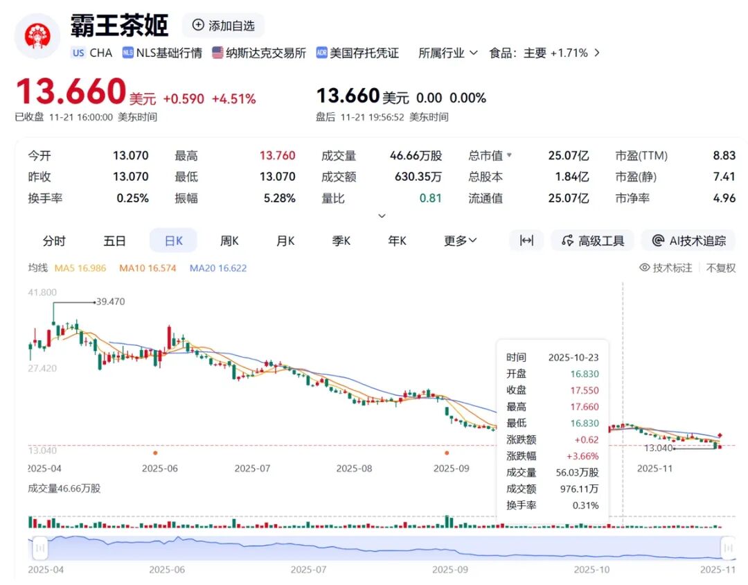 张俊杰这边,霸王茶姬2025年上半年净利润7.55亿元,同比暴跌38.32%。更触目惊心的是,Q2中国门店月均GMV同比暴跌24.84%,同店销售额增长率为-23.1%。因拒绝参与外卖补贴大战,霸王茶姬在消费寒冬中被竞品疯狂分流。上市5个月,市值从高点77亿美元蒸发至25亿美元,缩水近7成。
